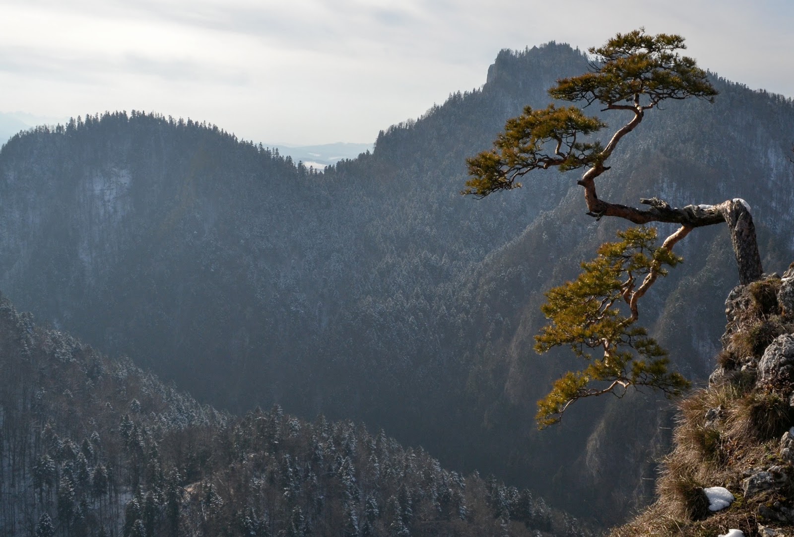 | Słynna reliktowa sosna, a w tle Trzy Korony |