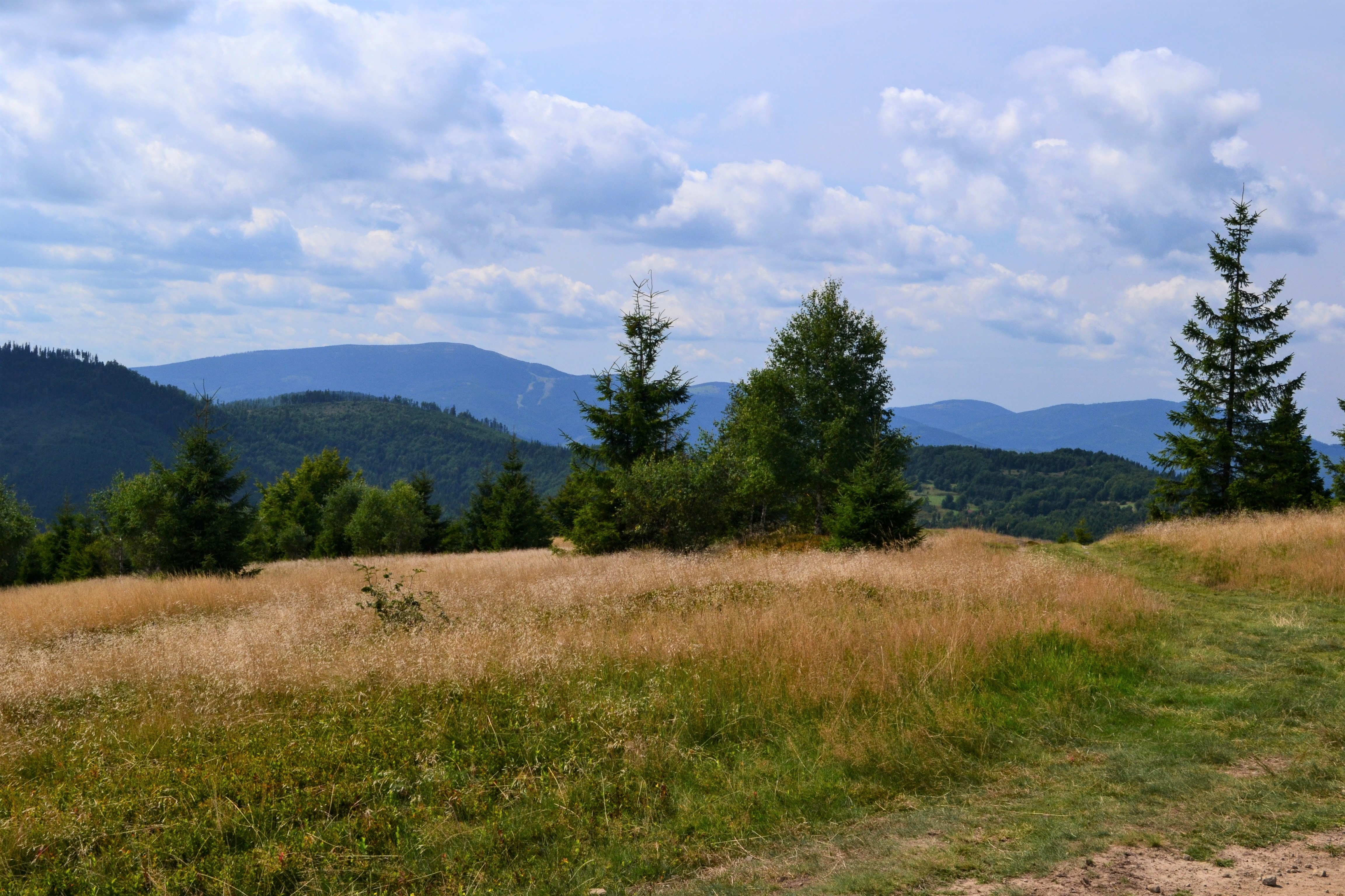 Kolejne kilometry upływają na znalezieniu dogodnego miejsca na spożycie śniadania. Wiadomo – w cieniu nie, na ziemi nie, bez widoków też średnio, aż w końcu docieram na szczyt Jaworzyniec i wypatruję rozległą polanę z widokiem na Beskid Żywiecki. Nie pozostaje mi nic innego, jak zboczyć ze szlaku i skonsumować tu posiłek, patrząc na Pilsko i Rysiankę, które odwiedziłam niespełna 2 tygodnie temu. Niebawem wracam na szlak, a moim celem jest obecnie Mędralowa, jednak najpierw muszę dotrzeć do czerwonego szlaku granicznego. Maszeruję wciąż wygodnie, mijam Małą Mędralową, po czym wkraczam na GSB.