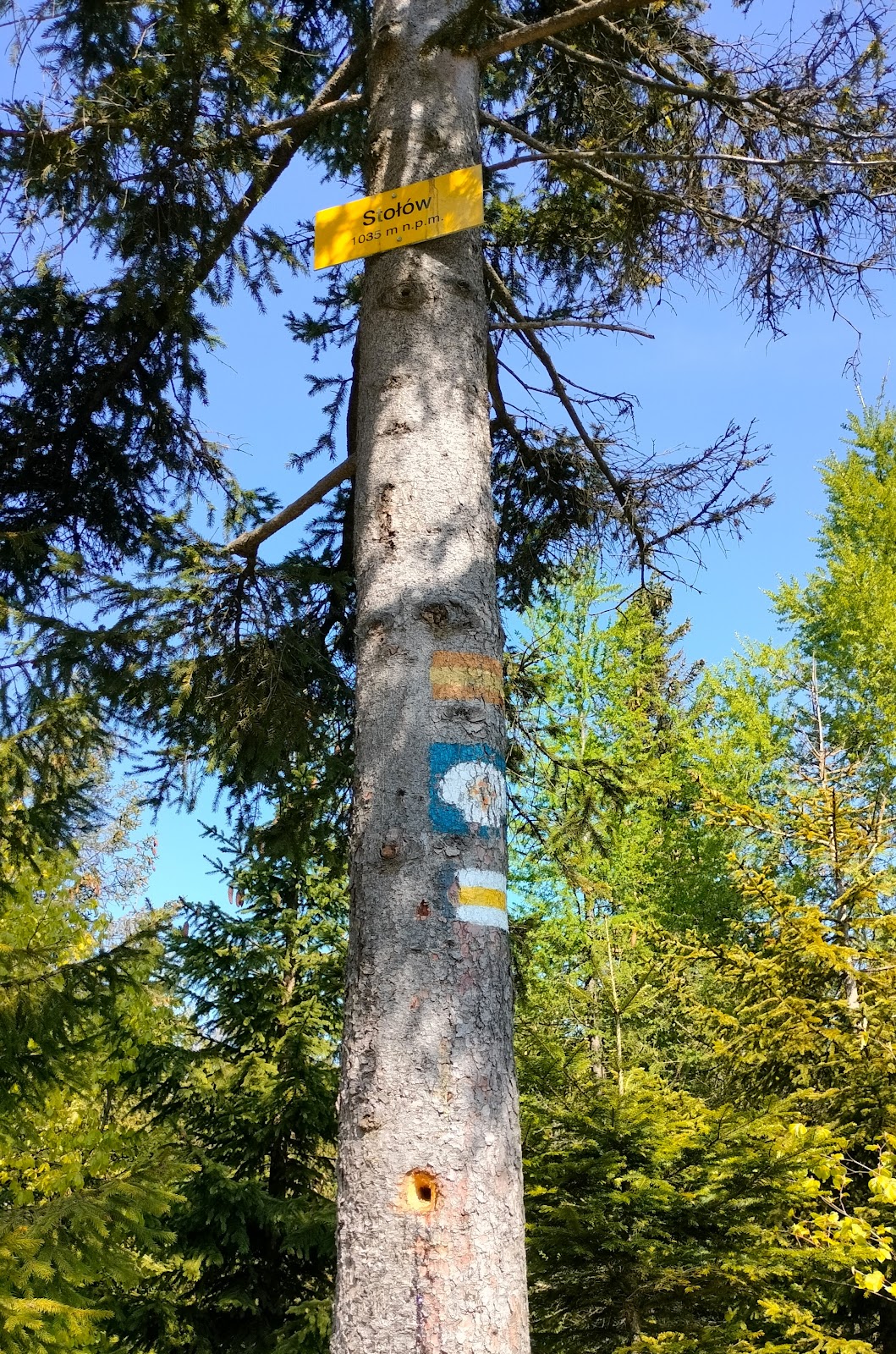 Wspomniany żółty wariant na Klimczok przewidziany jest na 1h 30 minut, a po drodze będę zdobywać jeszcze Stołów i Trzy Kopce. Na początek czeka mnie spore podejście, które przebiega szeroką drogą po luźnych kamieniach. Otoczenie wciąż jest przyjemne, choć dzisiejszy upał przerósł moje oczekiwania. Po 20 minutach melduję się na Stołowie, który nazwę wziął od płaskiego jak stół wierzchołka. Odtąd podążam już równym terenem, ścieżka jest pozbawiona widoków, ale krajobraz wciąż soczyście ładny. Niebawem czeka mnie kolejne podejście, tym razem na Trzy Kopce, a przebieg szlaku przez las ułatwia wędrówkę w ciepły dzień. O 9:45 melduję się na szczycie, który oferuje przyjemny widok na Skrzyczne. Co ciekawe, niegdyś na Trzech Kopcach znajdowało się schronisko turystyczne, jednak nie przetrwało ono wojny i dziś pozostały po nim tylko fundamenty.
