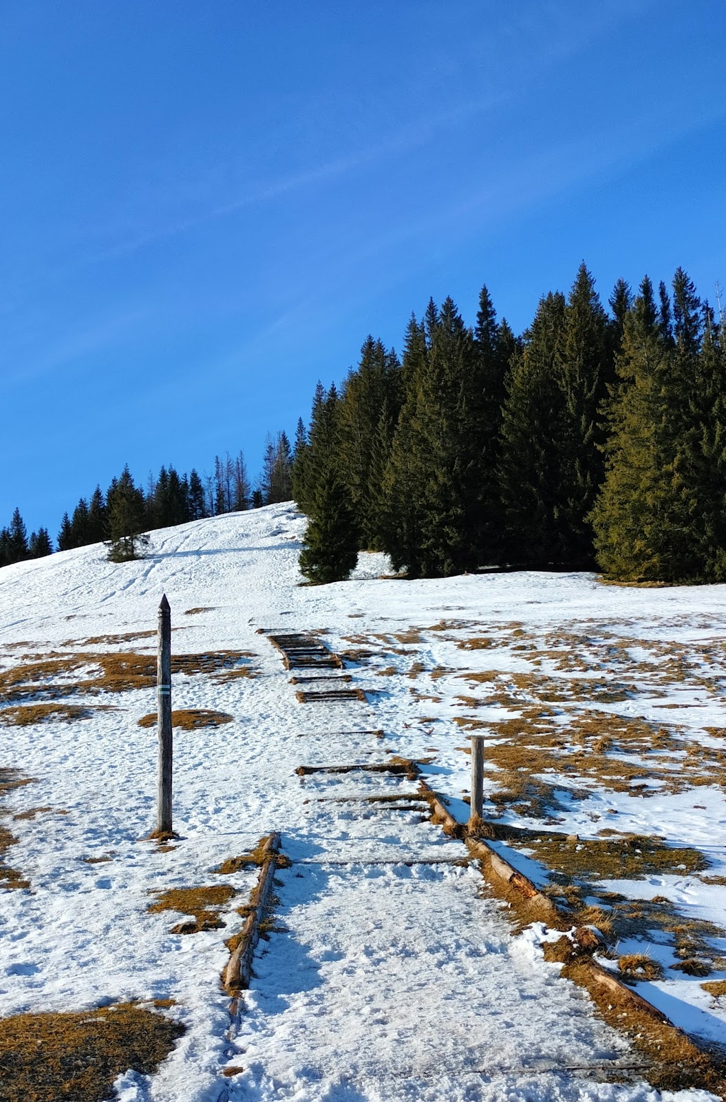 Po odpoczynku ruszamy szlakiem zielonym na Gęsią Szyję, a zdobycie szczytu o wysokości 1489m n.p.m. nie powinno zająć więcej niż 45 minut. Trzeba przyznać, że podejście zakrawa o wymagające, zwłaszcza kiedy podłoże jest pokryte śniegiem. Najpierw jego konsystencja jest cukrowa, potem coraz bardziej zbita, aż przeradza się w lodową rynnę. W tym momencie zbroję buty w raki i dalej już stabilnie podążam w górę. Szlak jest widokowy i pusty.